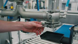 The butter filling machine OLAF has many strengths. For example, changing the packaging format is very easy. The box height is automatically adjustable to avoid splashing. When a box or bucket is placed in the OLAF, it will be lifted to the correct height to avoid splashing. The machine does a tare weight correction and then starts by coarsely filling the box or bucket. Once the required content is almost reached using the coarse dosing nozzle, the fine dosing nozzle takes over the filling process. Now, the box or bucket is supplemented till the precisely measured, accurate quantity is reached. After it has reached its correct weight it is discharged. In addition the machine is completely executed in stainless steel.